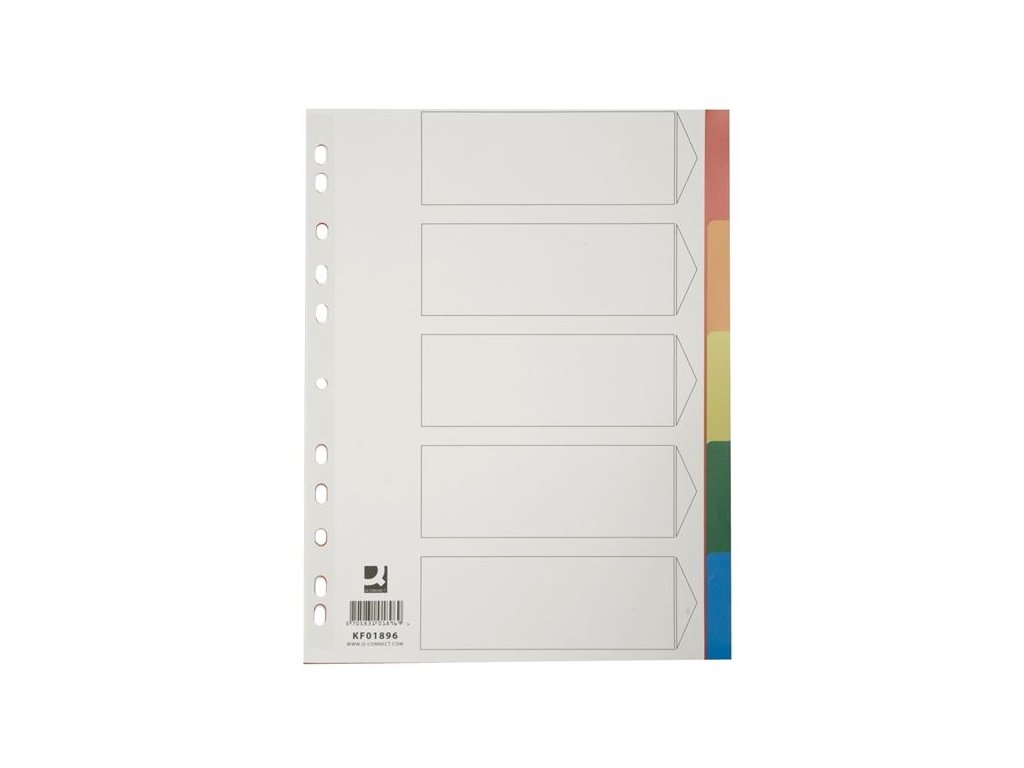 Plastové rozlišovače Q‑Connect ve formátu A4 s barevným okrajem pomáhají rychle a přehledně třídit dokumenty.
