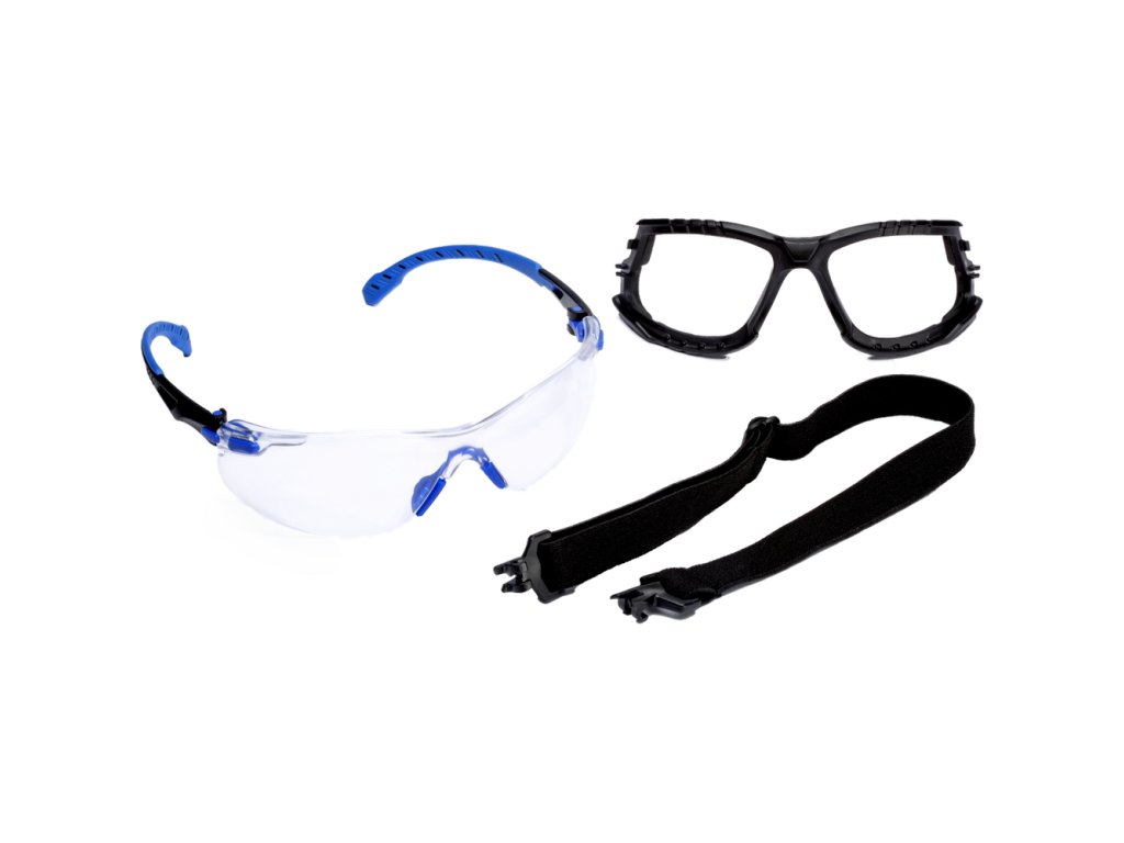Modro-černé ochranné brýle s čirým polykarbonátovým zorníkem ,s povrchem 3M Scotchgard proti zamlžování, pěnová vložka, upínací pásek.