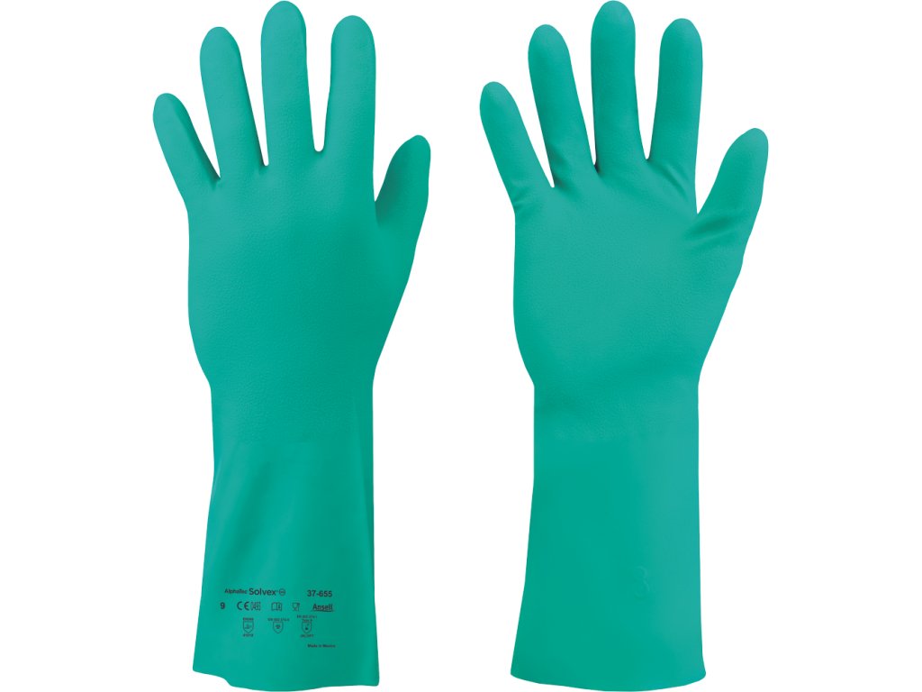 Ansell 37-655 Sol-Vex gloves jsou průmyslové rukavice navržené pro ochranu rukou při práci s nebezpečnými chemikáliemi a oleji.