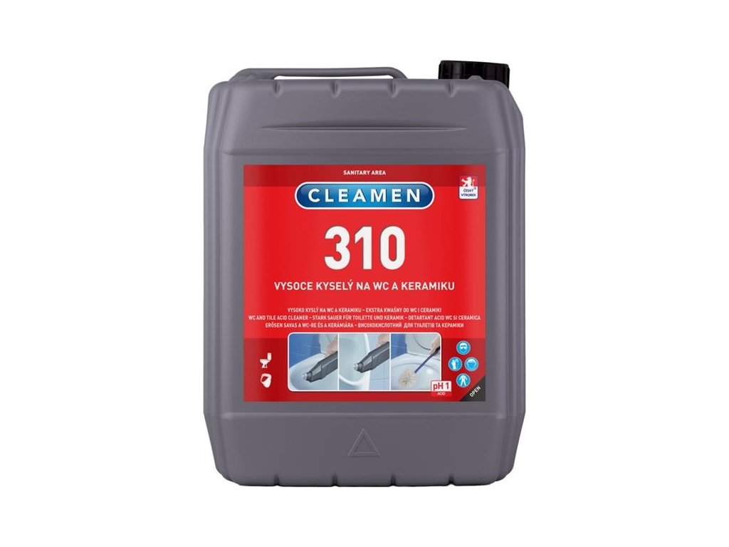 Vysoce účinný gelový čistič Cleamen 310 je určen k přímému použití na WC, pisoáry a další sanitární zařízení. Spolehlivě odstraňuje vodní kámen, rez i močové usazeniny a zanechává povrchy hygienicky čisté.