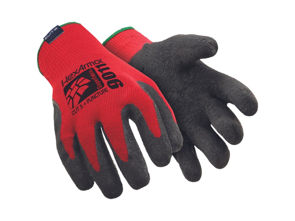 Bezešvé pletené rukavice, polomáčené v nitrilu, se zvrásněním a patentovanou vložkou proti propíchnutí a prořezu v dlani a na prstech, lze je prát.