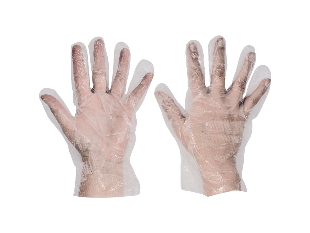 Jednorázové rukavice z transparentní polyetylénové fólie.