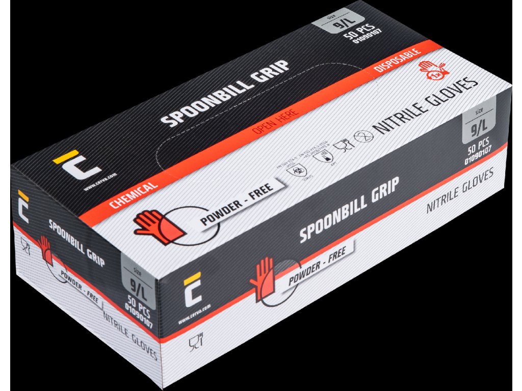 Jednorázové nitrilové rukavice CERVA SPOONBILL GRIP představují profesionální ochranný prostředek do nejnáročnějších podmínek. Jsou vyrobeny z vysoce odolného nitrilu, díky čemuž poskytují vyšší mechanickou odolnost než běžné jednorázové rukavice. Jejich klíčovou vlastností je diamantová textura po celém povrchu, která výrazně zvyšuje tření a umožňuje pevný úchop i při práci s olejem, vodou, chemikáliemi nebo znečištěnými součástkami. Rukavice jsou nepudrované, takže minimalizují podráždění pokožky a jsou vhodné i pro uživatele s citlivou či alergickou kůží. Díky extra síle materiálu nabízí výbornou odolnost proti protržení a jsou ideální pro dlouhodobé úkony, kde se vyžaduje jistota, bezpečí a vysoký cit v prstech. SPOONBILL GRIP splňují normy EN ISO 21420, EN ISO 374‑1 (typ B K6 P4 T6) a EN ISO 374‑5 (virus pass) a jsou také vhodné pro kontakt s potravinami, což rozšiřuje jejich použití i do potravinářských provozů.
