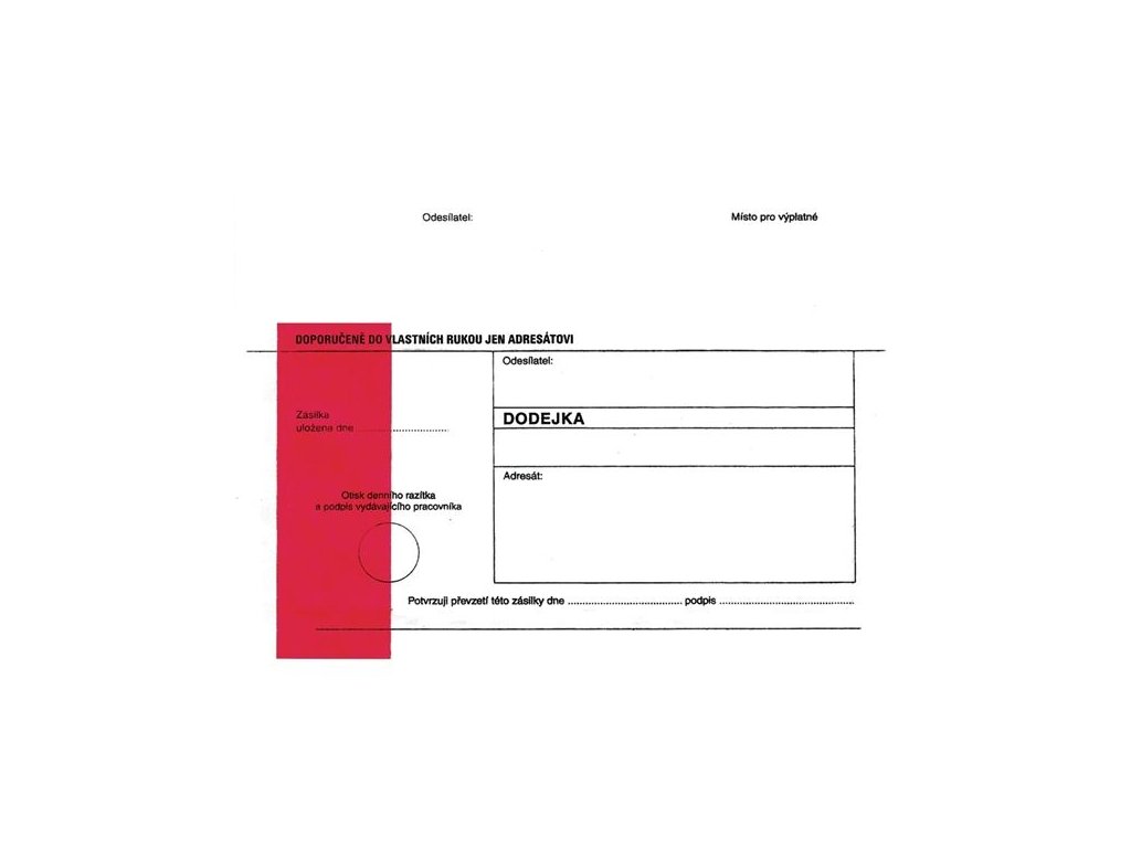 Obálka s červeným pruhem. Oblá klopa. Navlhčovací lepidlo. Předtištěný text DODEJKA.