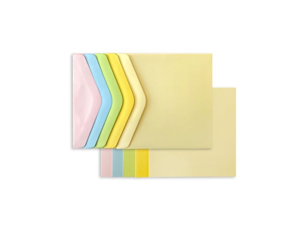 Elegantní sada obálek a kartiček ve čtvercovém formátu 14,5 × 14,5 cm s jemným saténovým povrchem v mixu barev.