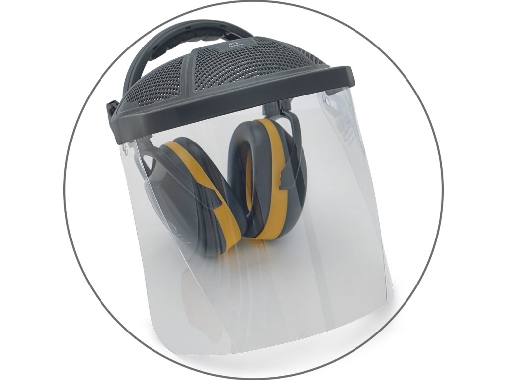 Polykarbonátové průhledné hledí pro použití v kombinaci s chrániči sluchu. Dobře se osvědčuje při práci jako je sekání trávy, stříhání keřů, broušení, stavební a průmyslové práce.
