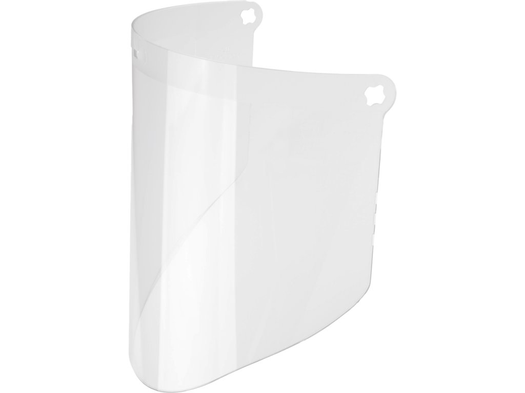 Čirý polykarbonátový obličejový štít WP96 je robustní 1,8 mm silný, tvarovaný polykarbonátový štít, který se obvykle používá tam, kde je vyžadována ochrana obličeje před vysokorychlostními částicemi nebo rozstřikem roztaveného kovu.