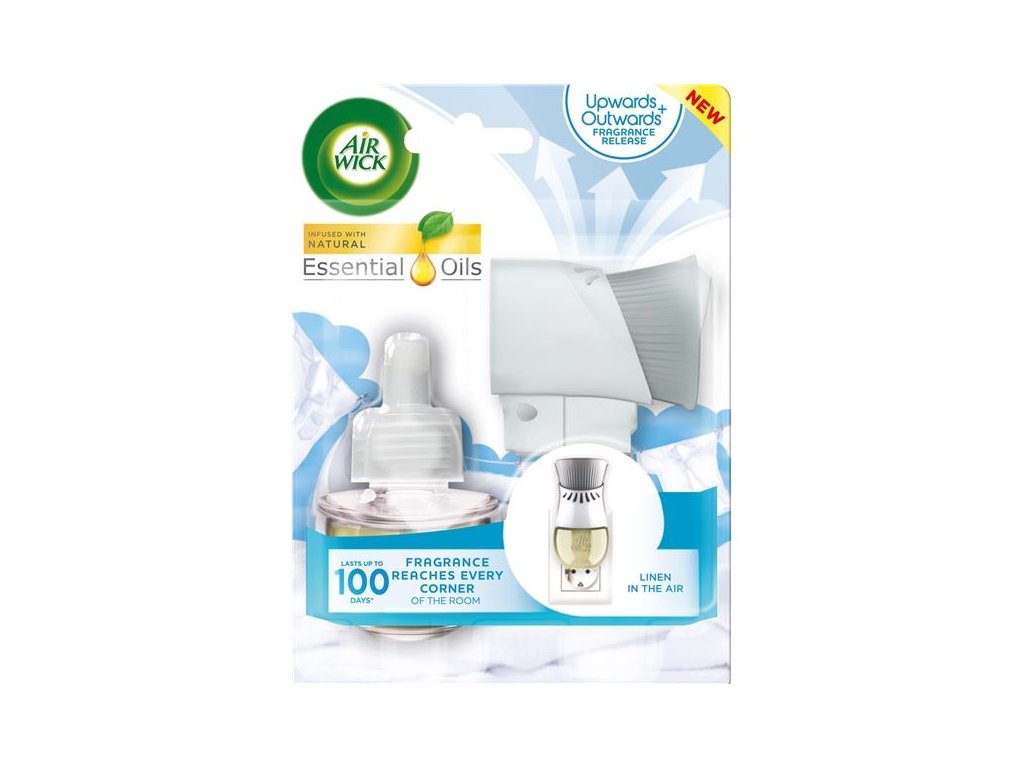 Osvěžovač vzduchu Airwick obsahuje elektrický strojek, který se zapojuje do elektrické zásuvky. Strojek je navržen tak, aby postupně uvolňoval vůni z náplně do vzduchu, čímž provoní váš prostor. Náplň obsahuje esenciální oleje, které se postupně uvolňují do vzduchu. Tekutá olejová náplň dodává do vaší kanceláře příjemnou vůni až na 75 dní (při používání 12 hodin denně na nejnižší úrovní intenzity).