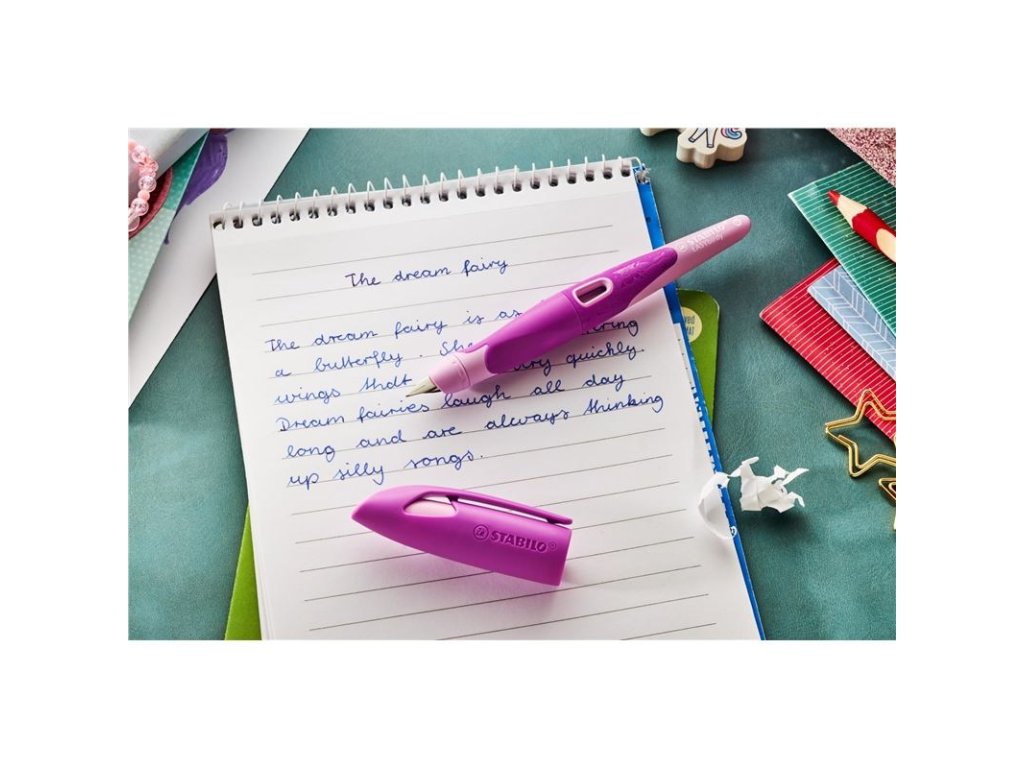 STABILO EASYbirdy 3D DreamWorld je školní plnicí pero navržené speciálně pro praváky, které spojuje ergonomii, funkčnost a kreativní design. Díky unikátní možnosti nastavení úhlu hrotu až o 30 stupňů se pero přizpůsobí individuálnímu stylu psaní dítěte, což zajišťuje ideální kontakt hrotu s papírem a podporuje čistý, uhlazený rukopis bez šmouh a škrábanců. Protiskluzová úchopová zóna pomáhá správnému držení pera, zatímco spolehlivý systém těsnění náplně chrání před nežádoucími skvrnami od inkoustu. Růžová varianta z edice DreamWorld přináší motivy inspirované pohádkovým světem a vesmírem, které jsou jemně vyryty do měkkého povrchu pera a lze je rozeznat i hmatem. Pero obsahuje praktické políčko na jmenovku a je vyrobeno z odolných materiálů, které zvládnou každodenní školní zátěž. STABILO EASYbirdy je dostupné v různých barevných kombinacích a představuje ideální volbu pro děti, které chtějí psát pohodlně, čistě a stylově.