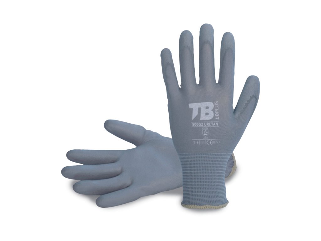 Rukavice z šedého bezešvého polyesteru. Šedý polyuretanový povlak na dlani.