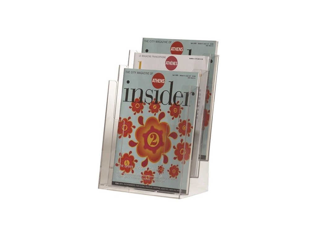 Jednoduchý stojan z průhledného akrylátu na dokumenty a katalogy s 3x přihrádkou.