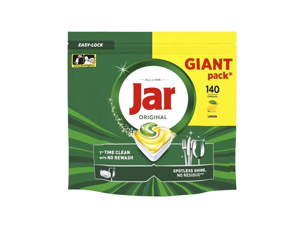 Účinné tablety do myčky Jar s citronovou vůní spolehlivě odstraňují mastnotu i zaschlé nečistoty a zanechávají nádobí dokonale čisté a lesklé.