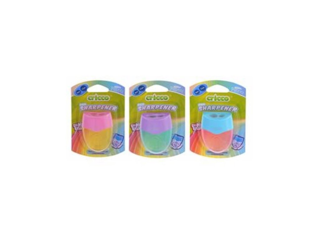 Pastelové dvojité ořezávátko Cricco je ideální do každého penálu, Určeno pro tužky a pastelky s trojúhelníkovým, šestihranným nebo kulatým průřezem, Má dva otvory - jeden o průměru 8 mm pro tužky a pastelky standardní velikosti a druhý o průměru 11 mm pro tužky a pastelky jumbo, Ořezávátko má nádobku na tužkové hobliny, V praktickém blistrovém balení.