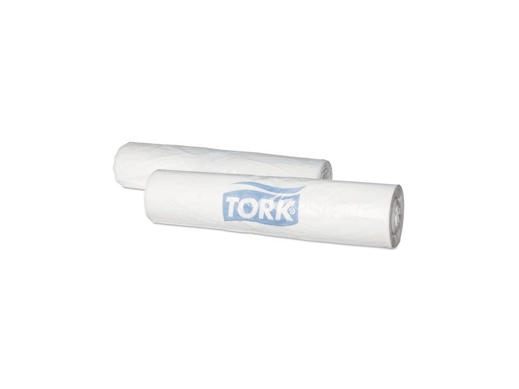 Bílé odpadkové pytle Tork B2 o objemu 20 litrů jsou pevné, hygienické a vhodné pro sanitární koše i běžné odpadové nádoby.