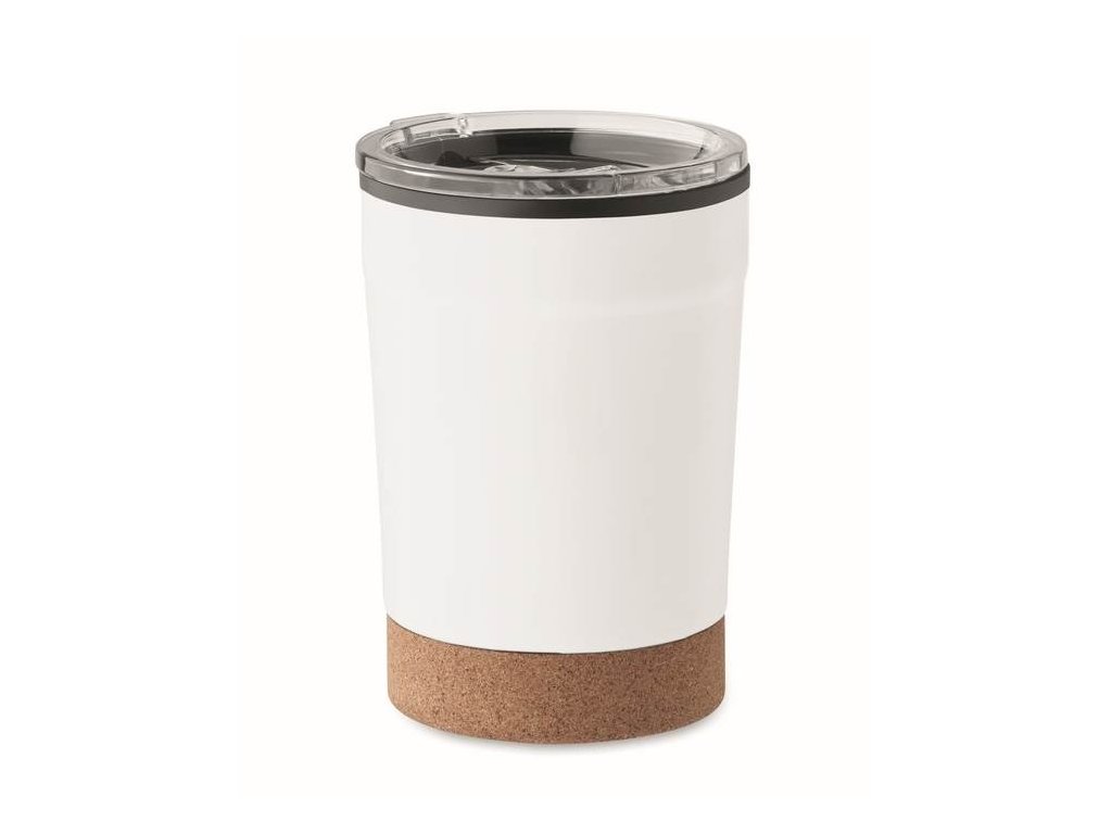 Dvoustěnný lesklý hrnek s plastovým posuvným otvorem na pití o objemu 300 ml. Vnější část je z nerezové oceli, spodek je olemován korkem. Vnitřek hrnku je z černého PP plastu.