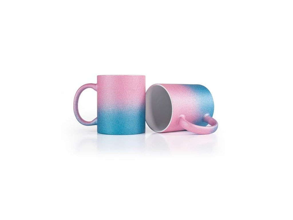 Originální keramický hrnek pro potisk o objemu 330 ml s jedinečným třpytivým povrchem v přechodu modré a růžové barvy je ideální volbou pro výrobu personalizovaných dárků i reklamních předmětů.