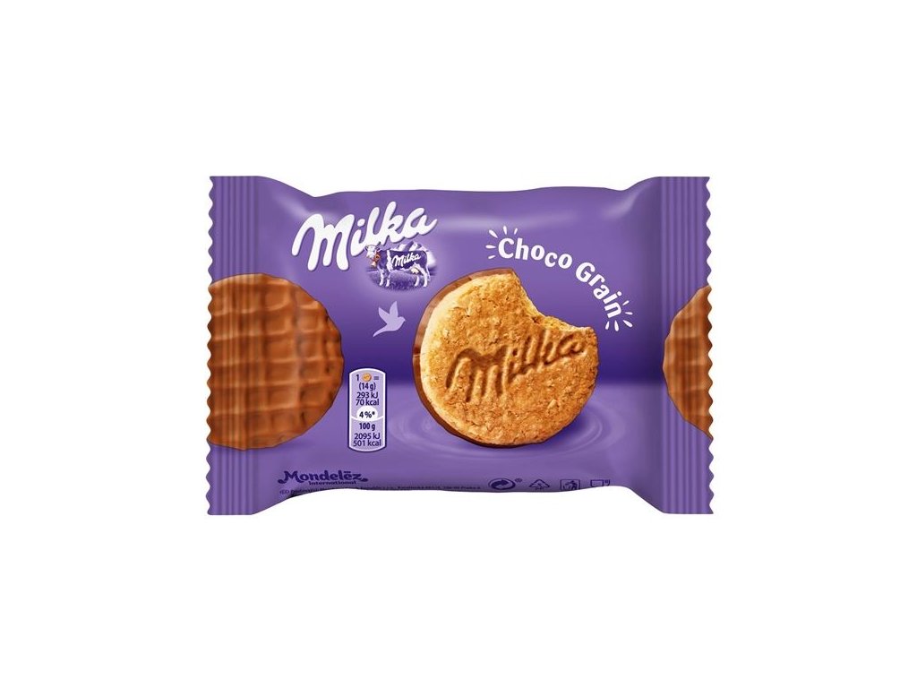 Sušenky s ovesnými vločkami a celozrnnou pšeničnou moukou polomáčené v mléčné čokoládě z alpského mléka (25%). Sladká svačina pro doplnění energie během dne.