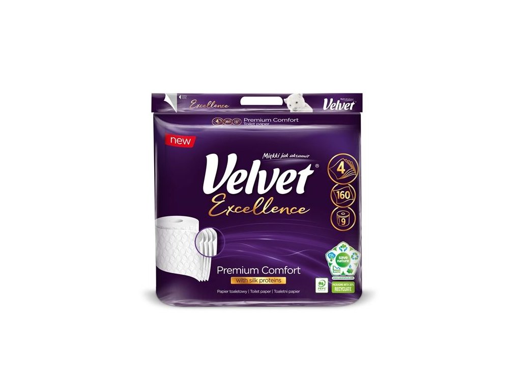 Luxusní 4vrstvý toaletní papír Velvet Excellence pro maximální jemnost a pevnost.