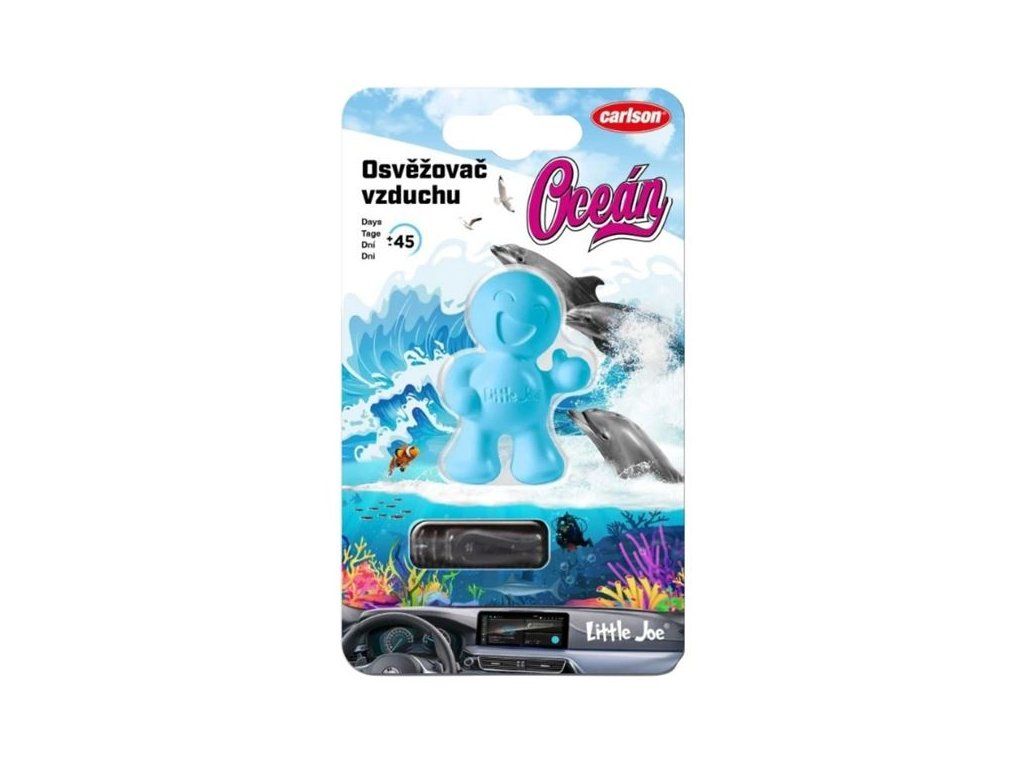 Svěží vůně do auta Carlson Little Joe v provedení Oceán přináší čisté a osvěžující aroma inspirované mořským vzduchem a oceánskou svěžestí. Originální 3D postavička ve tvaru usměvavého panáčka nejen provoní interiér vozu, ale zároveň slouží jako stylový designový doplněk. Díky praktické příchytce se snadno upevňuje do ventilační mřížky automobilu a zajišťuje rovnoměrné uvolňování vůně až po dobu 45 dní. Pomáhá neutralizovat nepříjemné pachy a vytváří příjemnou atmosféru při každé jízdě. Ideální pro každodenní použití v osobních i služebních vozech.