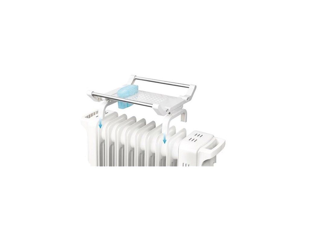 Kompaktní radiátorový sušák ECG OR 2090 s extra plochou mřížkou, dvěma bočními příčkami a nádobkou na vodu pro zvlhčení vzduchu.