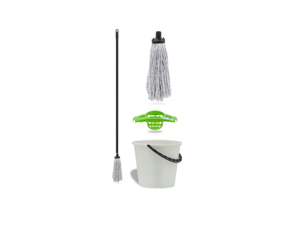 Úklidový set Vektex – mop, vědro a ždímač je praktická sada pro pohodlné a efektivní vytírání všech typů podlah v domácnosti. Set obsahuje mop s tyčí, plastové vědro a ždímací nástavec, který umožňuje snadné vyždímání bez nutnosti kontaktu rukou s vodou.
