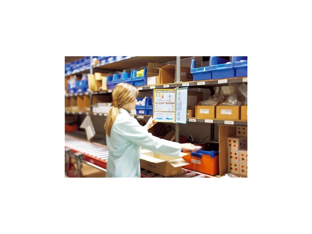 DRŽÁK MAGNETICKÝ: Systém držáku a 5 barevných rámečků pro přehlednou evidenci a prezentaci informací na kovové ploše. Rámeček je vyztužen ocelovým drátem, který zabezpečuje stálý a zároveň pružný lem. Díky kovovým úchytům ho lze rychle upevnit a vyjmout. Rámeček s kapsou chrání dokumenty proti nečistotám a vlhku, zároveň je lze snadno vyměňovat. Využití nachází v průmyslových provozech, skladech, obchodech atd. Oboustranné rámečky s kapsami A4 a 5 indexovými záložkami, otevřené shora. Orientace rámečků vertikální. Magnetická zadní strana. Ocelové vyztužení rámečků. Držák kovový (RAL 7035), rámečky s kapsami antireflexní PVC. 4 plastové aretační zarážky.