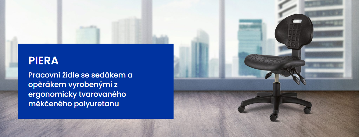 Pracovní židle se sedákem a opěrákem tvořenými z ergonomicky tvarovaného měkčeného polyuretanu černé barvy. Díky svému provedení se židle snadno udržuje čistá. V základním provedení židle disponuje židlovým pístem - výška sedu 40 - 53 cm. PIERA je určena pro průmyslové použití v dílnách, výrobních závodech, potravinářském průmyslu, laboratořích apod. Odolná pracovní židle umožňuje různé možnosti konfigurace a nastavení a zajišťuje tak vysoký komfort při práci na různých typech pracovišť. Ergonomicky tvarovaný sedák a opěrák je vyroben z odolného polyuretanu, který lze díky provedení snadno čistit.
